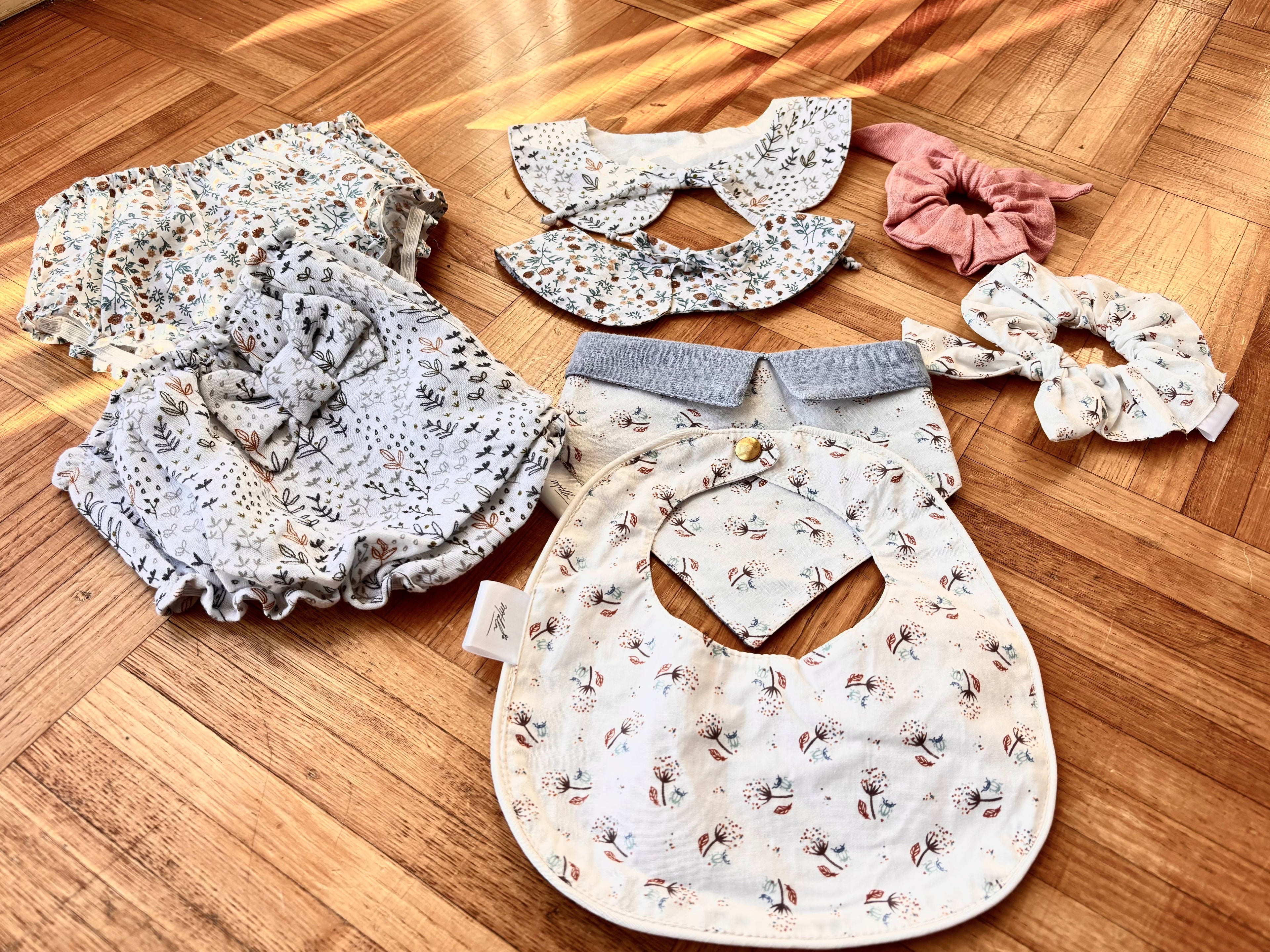 De petites pièces précieuses confectionnées dans nos tissus de collections : cols, culottes, bandeaux, chouchous et bavoirs, pour ajouter une touche délicate et élégante à chaque tenue.