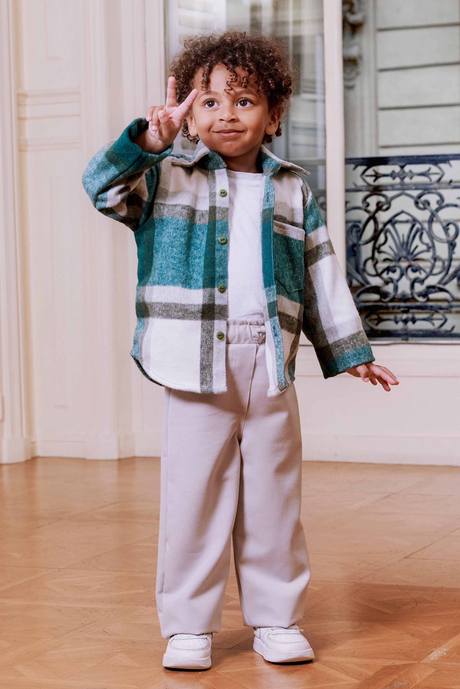 Douillet et lumineux, l’ensemble JASPE associe une surchemise à carreaux vert émeraude et un pantalon ample confortable, parfait pour l’hiver.